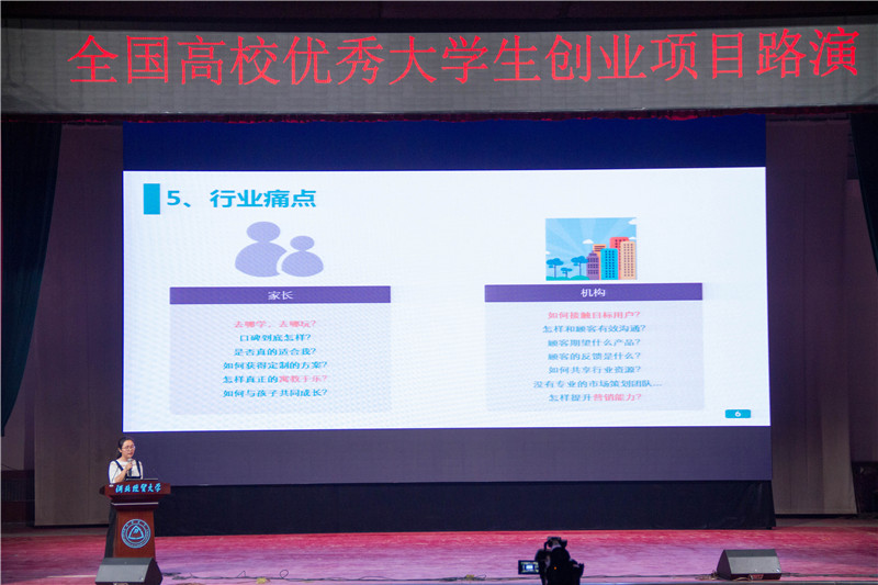 24日晚,全国高校优秀大学生创新创业项目路演在校礼堂举行,来自河北经贸大学、山东师范大学等高校的八个精品项目介绍人逐一登台对项目的具体内容、实施环境、收益预估等方面进行了阐释和自荐,投资机构投资人进行针对性点评并为各项目举牌,以示投资兴趣。