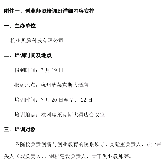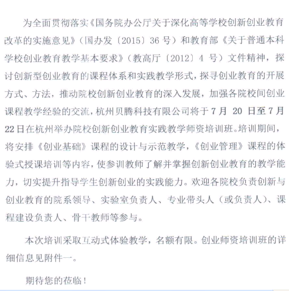 为推动院校创新创业教育的深入发展,加强各院校间创业课程教学经验的交流,杭州贝腾科技有限公司将于7月20日至7月22日在杭州举办院校创新创业教育实践教学师资培训班。