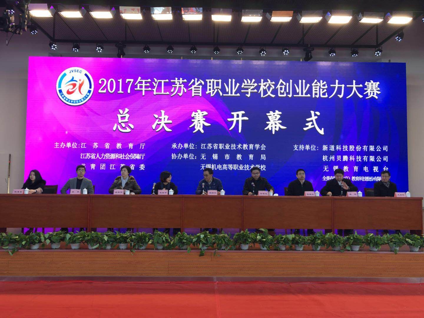 12月12-13日,2017年江苏省职业学校创业能力大赛总决赛在无锡机电高等职业技术学校举行。本次大赛由江苏省教育厅、江苏省人力资源和社会保障厅、共青团江苏省委主办,江苏省职业技术教育学会承办,无锡市教育局、无锡机电高等职业技术学校协办。江苏省职业技术教育学会杨湘宁会长,无锡市教育局符菊成副局长,省教育厅职业教育处张善平副处长,省人社厅技能教研中心张耀武副主任,团省委少年部徐美华副部长,贝腾科技董事长黄林先生等出席了大赛开幕式。