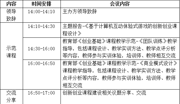 一、互动体验式的教学方法教学展示,《创业基础》典型课程单元示范教学。现场体验创新创业教育实践教学的效果、学习先进的创新创业教学方式、切实提高创新创业教育的实践教学能力。会议具体内容信息详见附件。