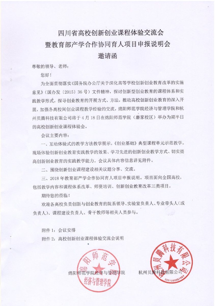 四川省(绵阳站)高校创新创业课程体验交流会 暨教育部产学合作协同育人项目申报说明会 邀请函