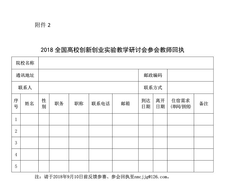 附件2:2018全国高校创新创业实验教学研讨会参会教师回执 点击下载