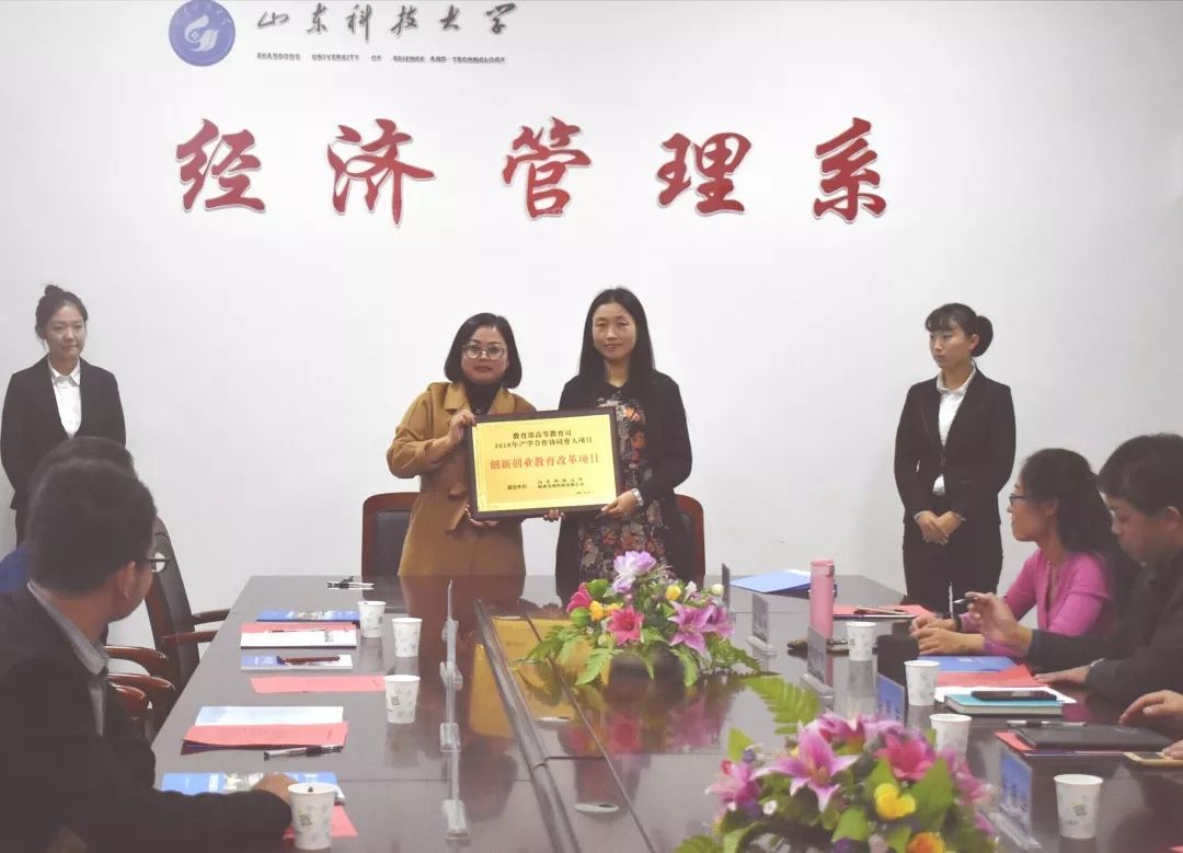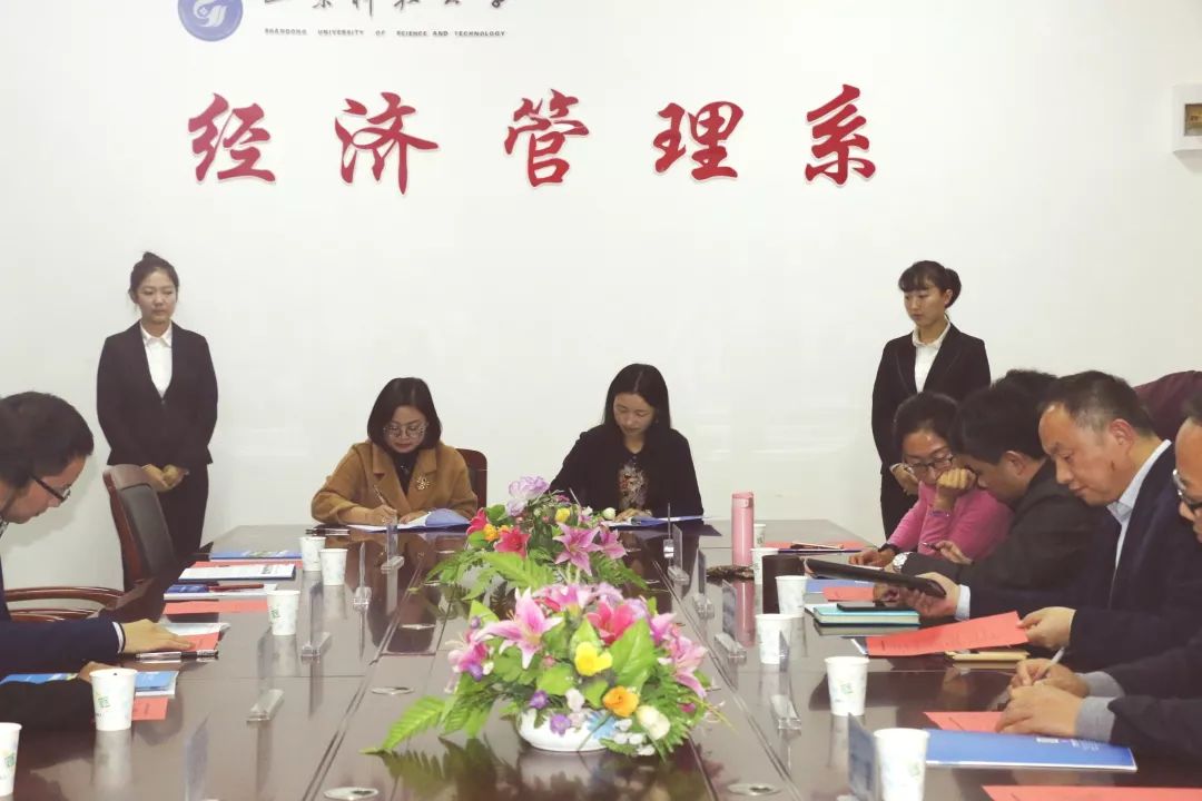 11月15日,山东科技大学泰安校区经管系在系会议室举行2018年第一批教育部产学合作协同育人项目签约仪式。经管系党总支书记张恩生、系副主任张振华、刘庆志,杭州贝腾科技有限公司华北区域销售总监马姗姗、山东区域经理张伟晓出席签约活动,仪式由刘庆志主持。