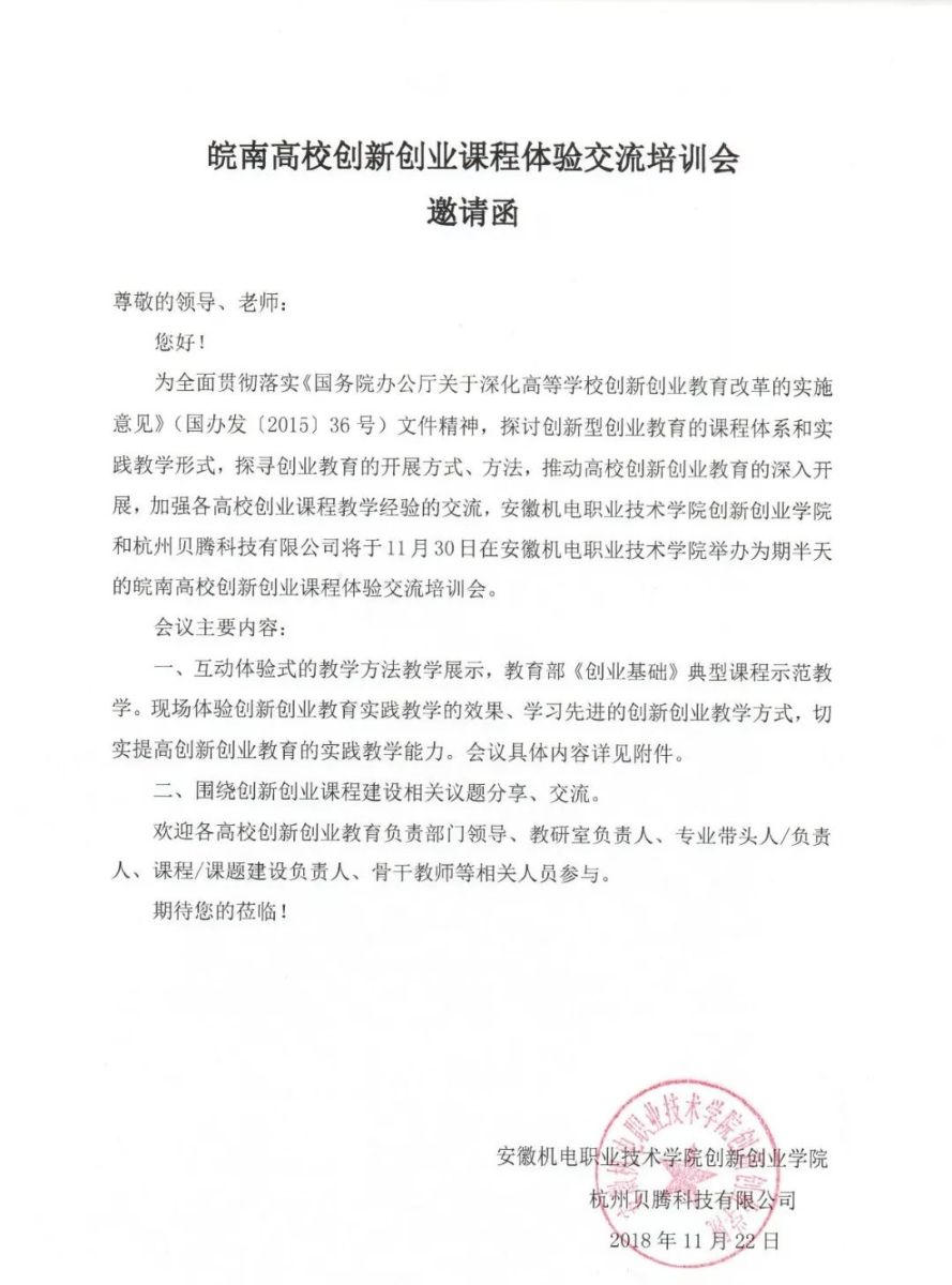 皖南高校创新创业课程体验交流培训会邀请函