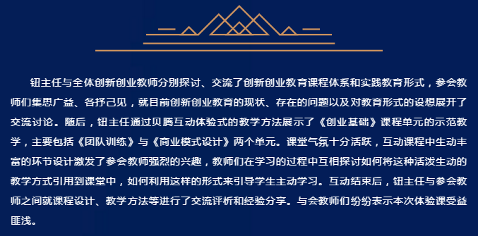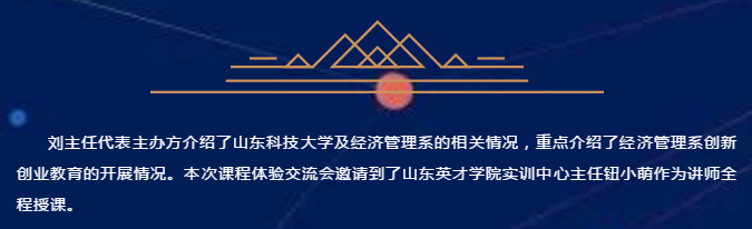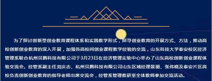 为了探讨创新型创业教育课程体系和实践教学形式,探寻创业教育的开展方式、方法,推动高校创新创业教育的深入开展,加强各高校间创业课程教学经验的交流,山东科技大学泰安校区经济管理系联合杭州贝腾科技有限公司于3月23日在经济管理实验中心举办了山东高校创新创业课程体验交流会。