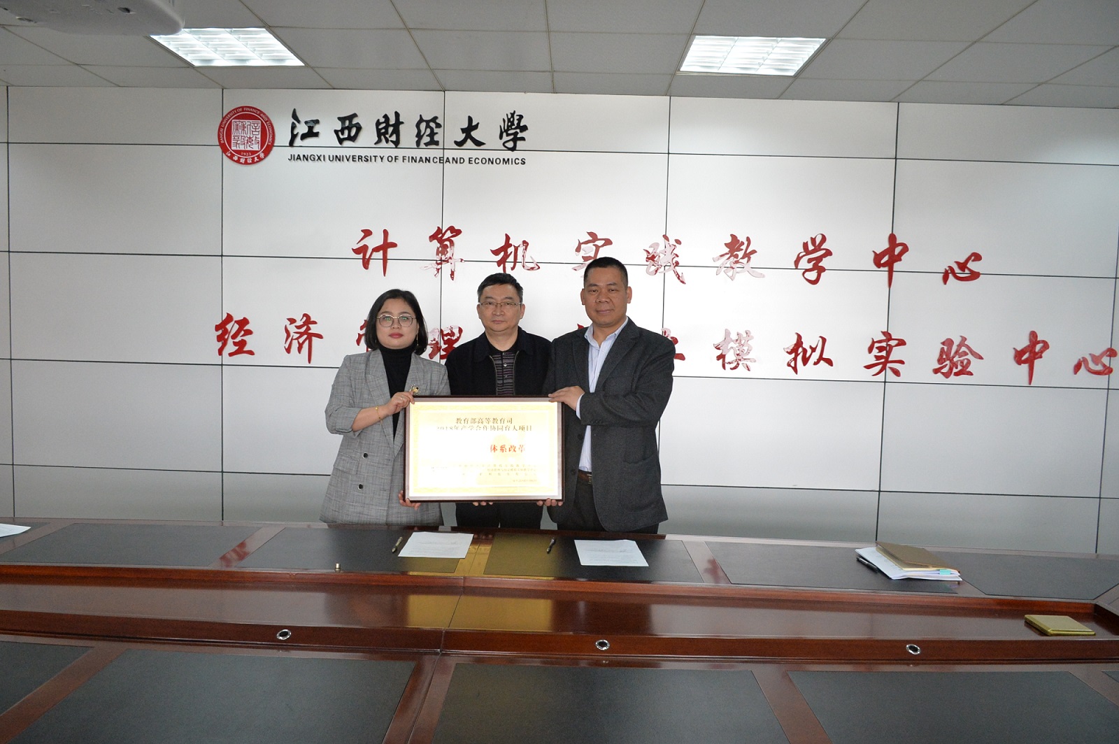 2019年4月12日上午,教育部“产学合作协同育人——教学内容与课程体系改革项目”揭牌仪式在江西财经大学计算机实践教学中心、经济管理与创业模拟实验中心举行。中心主任陆旭、副主任王根生、办公室主任宗云、中心相关老师以及杭州贝腾科技有限公司华北大区总监马姗姗、江西省区经理杜弦参加了此次揭牌仪式。