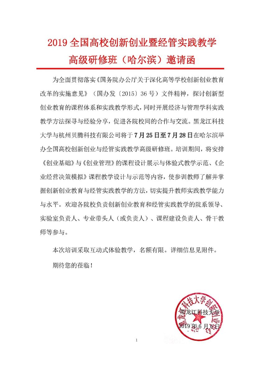 2019全国高校创新创业暨经管实践教学高级研修班(哈尔滨)邀请函
