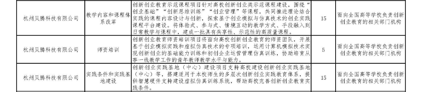 在近日公布的“教育部高等教育司关于公布有关企业支持的产学合作协同育人项目申报指南(2019年第二批)的通知”中,杭州贝腾科技有限公司支持项目为35项,分别为教学内容和课程体系改革项目、师资培训项目、实践条件和实践基地建设项目三大类。