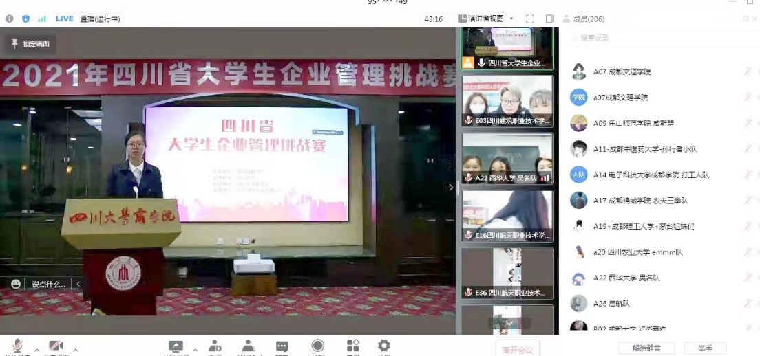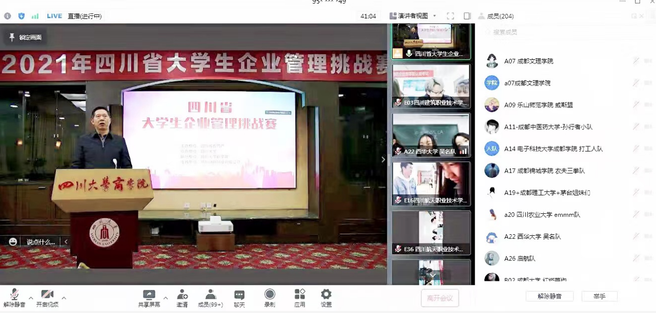 2021年11月13日,四川省大学生企业管理挑战赛决赛顺利举行。本次大赛由四川省教育厅主办,四川大学承办,四川大学商学院具体执行,杭州贝腾科技有限公司提供技术支持。经各院校组织预赛后,40所本科院校的120支团队和27所高职高专院校72支团队进入决赛。