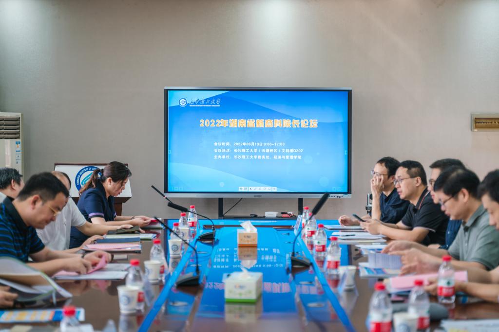 为进一步落实立德树人根本任务,探索新商科建设发展之路,促进学生专业实践能力和研究创新能力的提升,6月19日,由长沙理工大学教务处、经济与管理学院共同主办的2022年湖南省新商科院长论坛在云塘校区文科楼D202隆重召开。湖南省教育厅高教处副处长王荣,长沙理工大学副校长曾祥君,中南大学商学院副院长李大元,湖南大学工管院副院长周忠宝,湖南师范大学商学院副院长曹虹剑,湘潭大学商学院副院长醋卫华,湖南科技大学商学院副院长张志彬,湖南农业大学商学院副院长莫鸣,南华大学经济管理与法学学院副院长陈鸣,长沙理工大学教务处处长刘思强、创新创业教育学院院长蒋加伏、经管学院党委书记丁丹、副院长彭新宇、刘坚,以及“学创杯”竞赛全国组委会委员、杭州贝腾科技有限公司执行董事、总经理黄林等30余人出席会议,会议由经管学院党委书记丁丹主持。