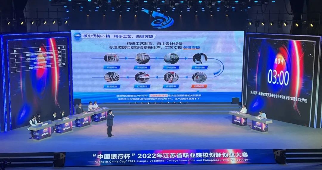 决赛在小组答辩基础上,举办了四强争夺赛和冠亚军争夺赛。最终,江苏农林职业技术学院“海草坪”项目、江苏农牧科技职业学院“一心向阳——阳光玫瑰中国绿色葡萄引领者”项目分获冠亚军,扬州工业职业学院“神机妙收——叶菜智能收获先锋”项目、江苏商贸职业学院“恒泰高科——玻璃钢空腹板格栅专精特新领军者”项目获得季军。