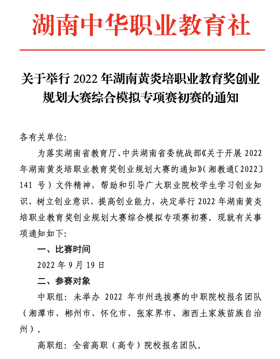 关于举行2022年湖南黄炎培职业教育奖创业规划大赛综合模拟专项赛初赛的通知