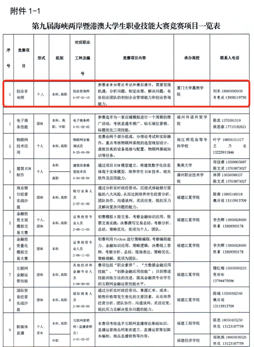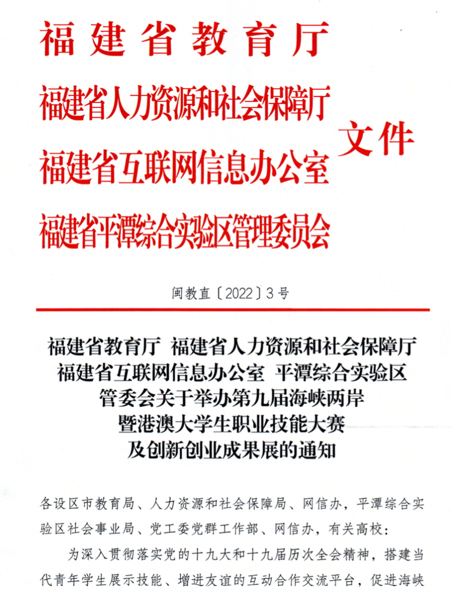由福建省教育厅、福建省人力资源和社会保障厅、福建省互联网信息办公室、平潭综合实验区管委会联合发文的《关于举办第九届海峡两岸暨港澳大学生职业技能大赛及创新创业成果展的通知》正式发布。