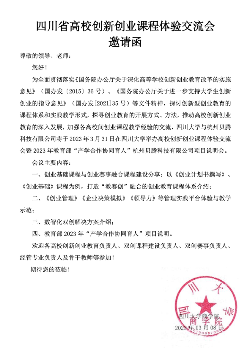 四川省高校创新创业课程体验交流会邀请函