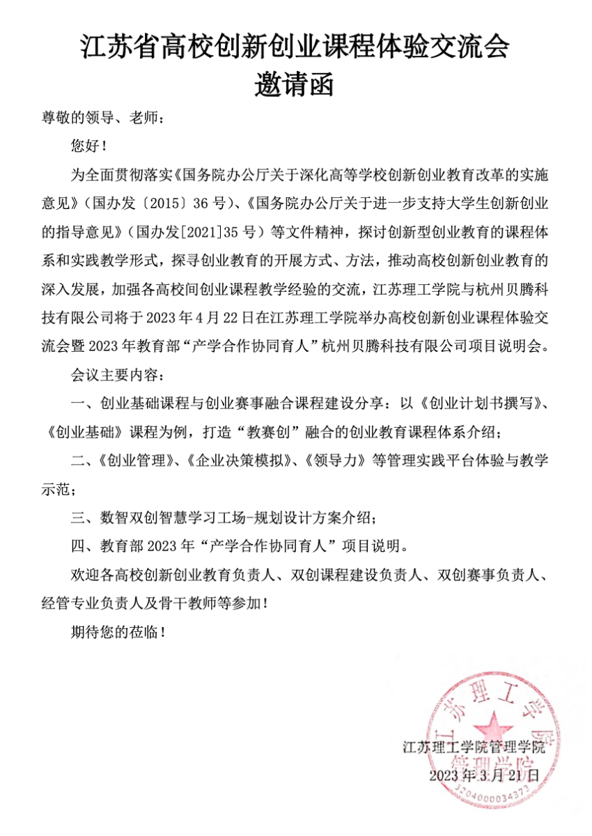江苏省高校创新创业课程体验交流会邀请函
