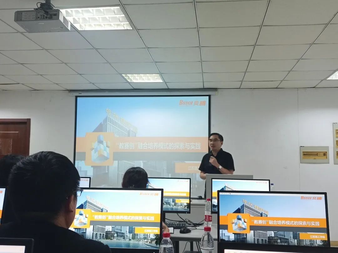 会上,贝腾科技市场总监肖竟成向教师们作“教赛创”融合课程分享,介绍了数智双创智慧学习工场的规划设计方案。在本次活动中参会人员可以亲身体验双创实践课程核心模块,旨在帮助院校加强创业学院实体建设、课程内容体系建设、创业生态系统建设。