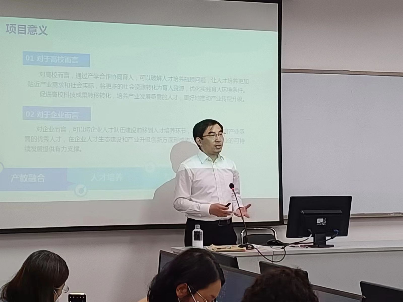 随后,杭州贝腾科技有限公司市场部总监肖竟成先生代表致辞并对2023年“产学合作协同育人”项目申报作出说明。分享了创意到创业-互联网+项目计划书进阶之路,带领了参会教师体验双创实践课程的核心模块。