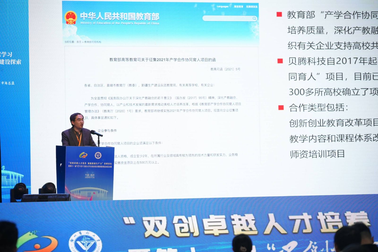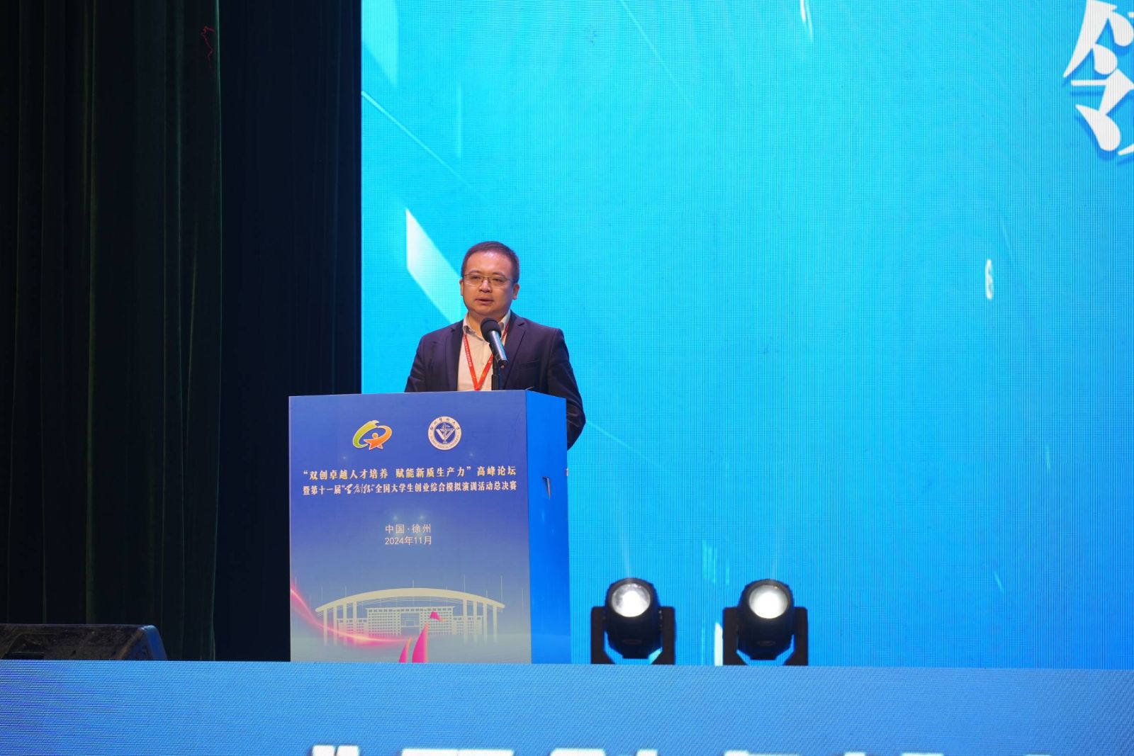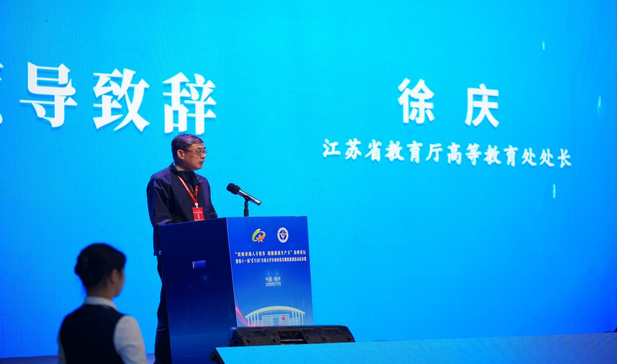江苏省教育厅高等教育处处长徐庆发表致辞,他强调了创新创业教育在培养新时代人才中的重要性,并对大赛的举办表示了高度肯定和支持。