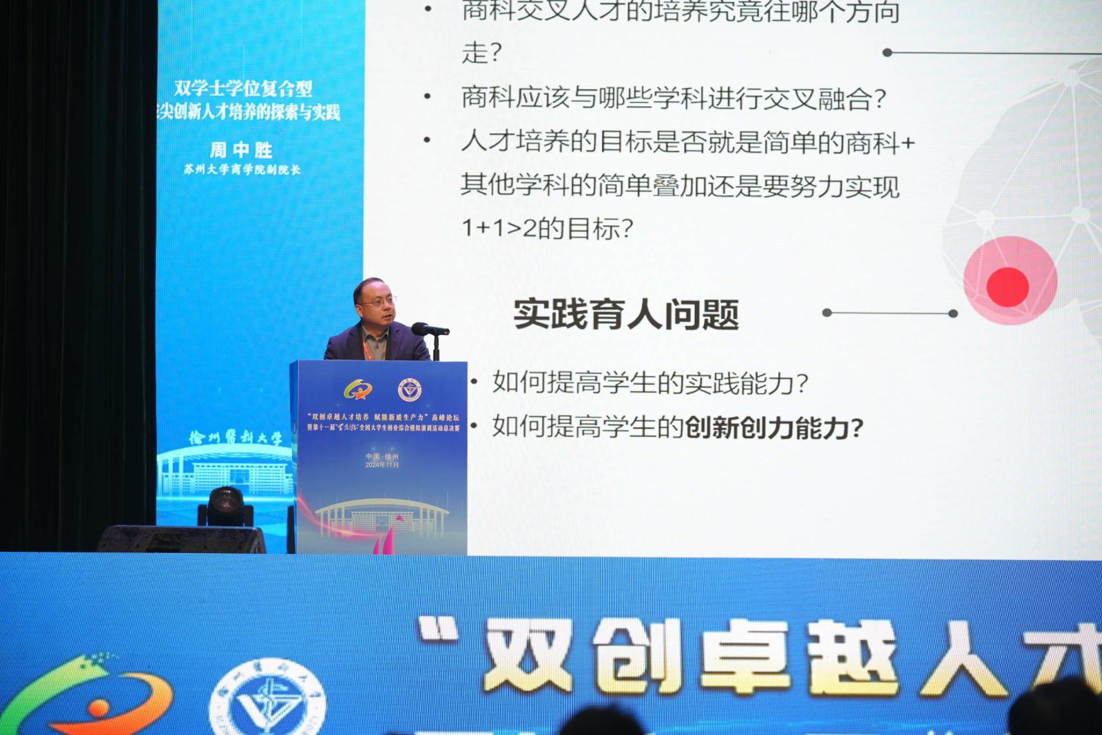 苏州大学商学院副院长周中胜以“双学士学位复合型拔尖创新人才培养的探索与实践”为题,介绍了苏州大学在培养复合型拔尖创新人才方面的经验和成果。