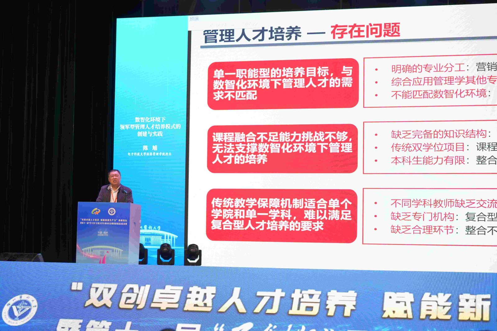 电子科技大学经济管理学院院长陈旭以“数智化环境下领军型管理人才培养模式的创建与实践”为题,探讨了数智化环境下领导型人才培养模式的创新与实践。