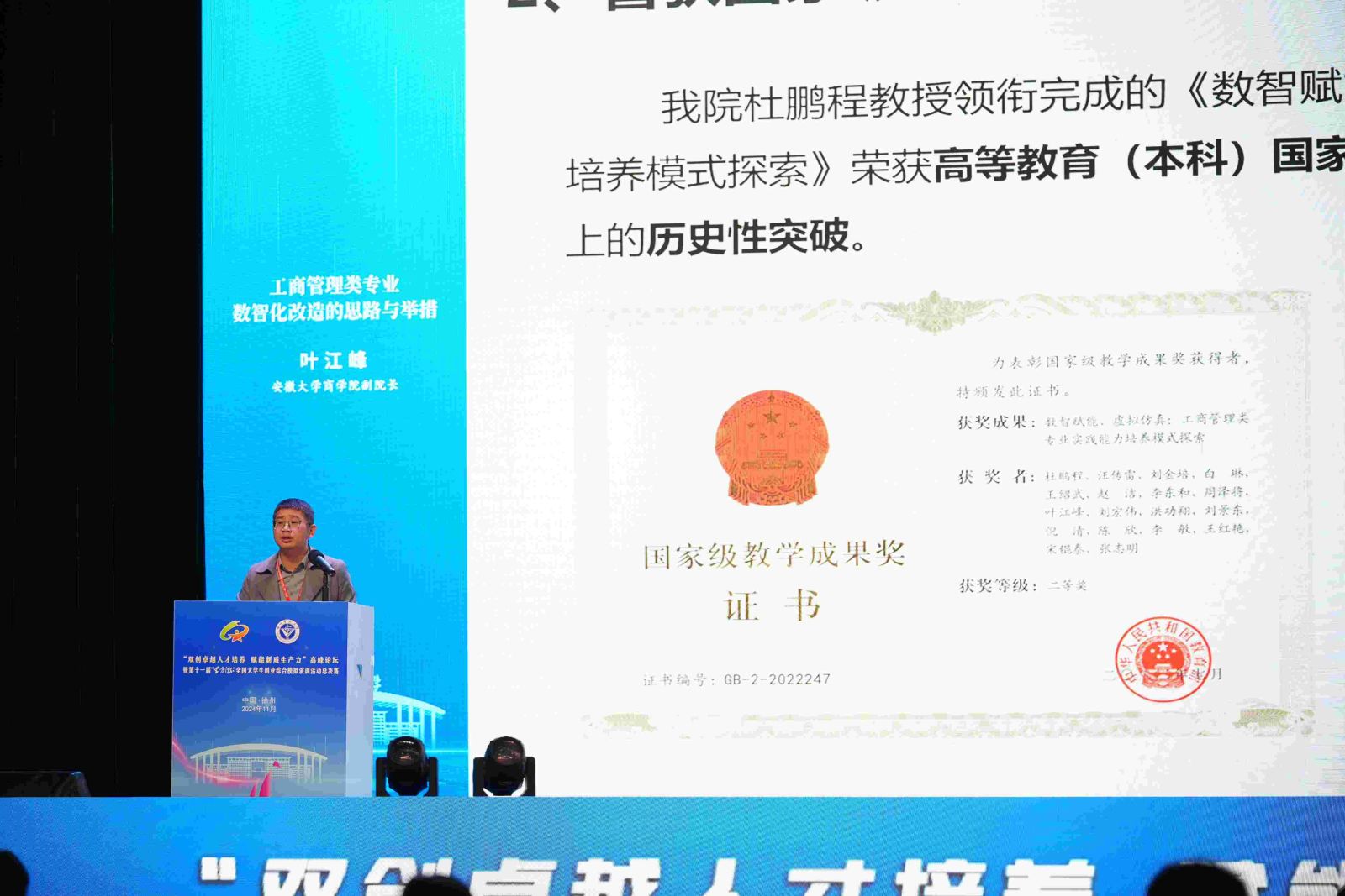 安徽大学商学院副院长叶江峰以“工商管理类专业数智化改造的思路与举措”为题,分享了安徽大学在工商管理类专业数智化改造方面的经验和成果。
