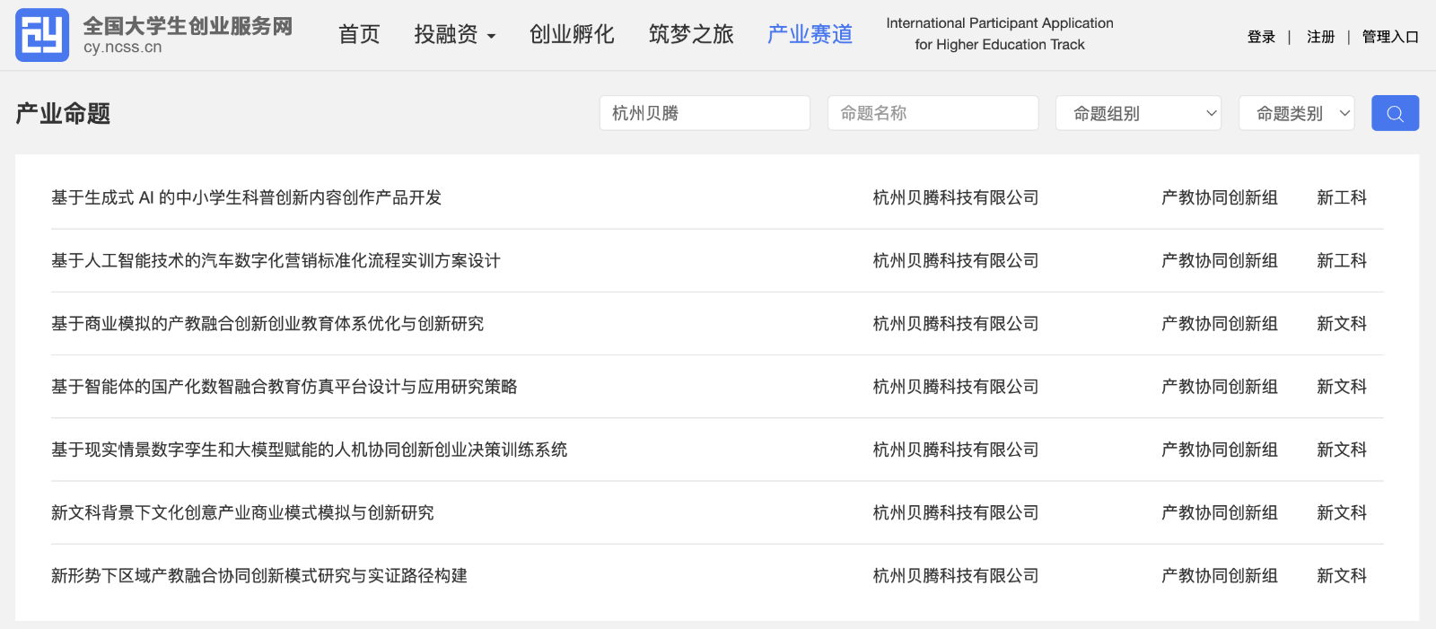 2025年5月29日,中国国际大学生创新大赛组织委员会正式发布了《关于公布中国国际大学生创新大赛(2025)产业赛道入选企业命题的通知》,杭州贝腾科技有限公司围绕新文科对应的产业和行业领域,基于企业发展真实需求进行命题申报,共有七道命题成功入围产业命题赛道。