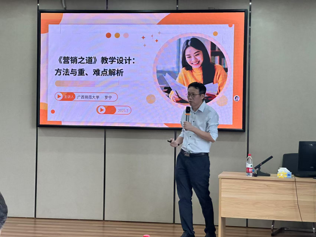 罗老师从课程概述、教学目标、教学方法、重点解析、难点突破、考核评价等方面逐步讲解了《营销之道》的教学设计,最后罗老师总结《营销之道》教学需以实战为核心,以数据为支撑,以团队协作为纽带。重点培养学生“经营理念→数据建模→动态调整”的完整商业思维链。