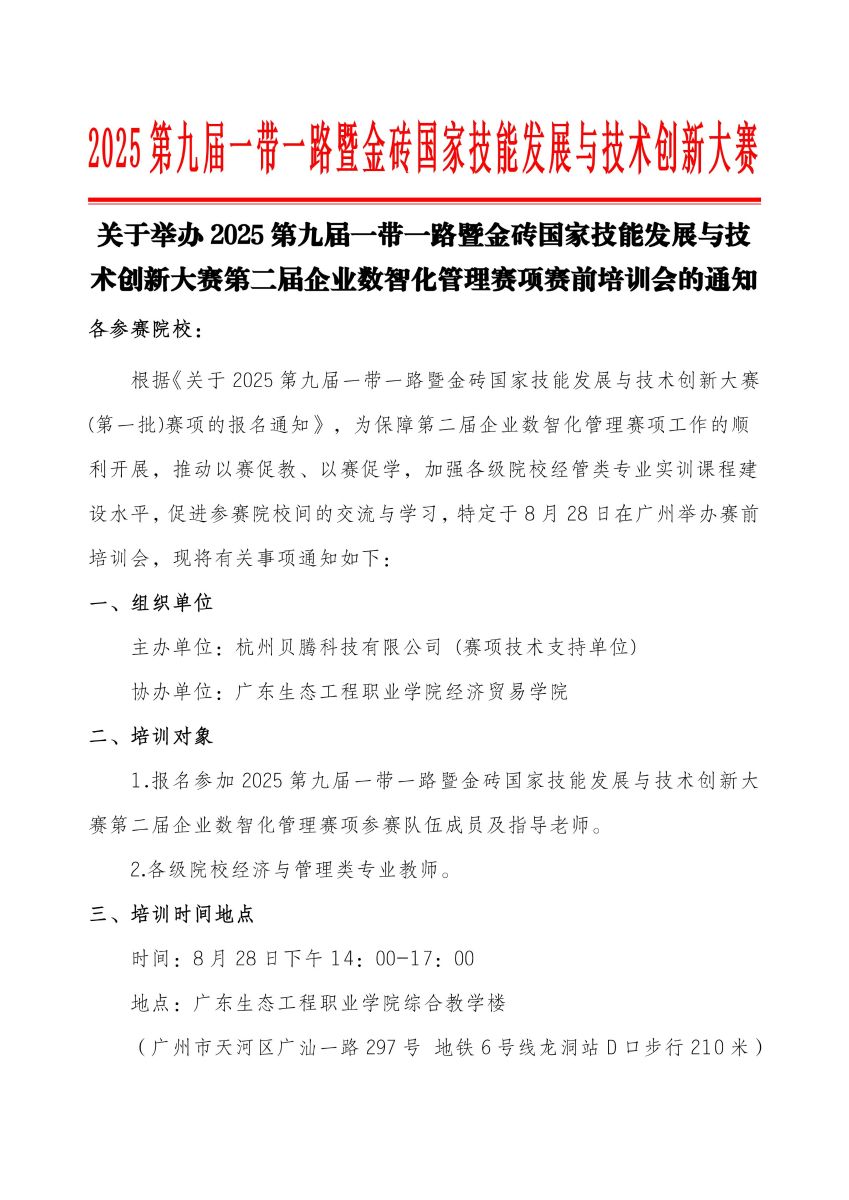 关于举办2025 第九届一带一路暨金砖国家技能发展与技术创新大赛第二届企业数智化管理赛项赛前培训会的通知