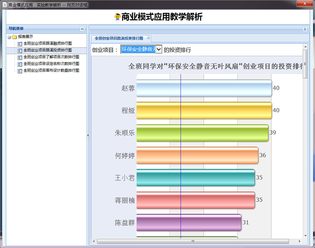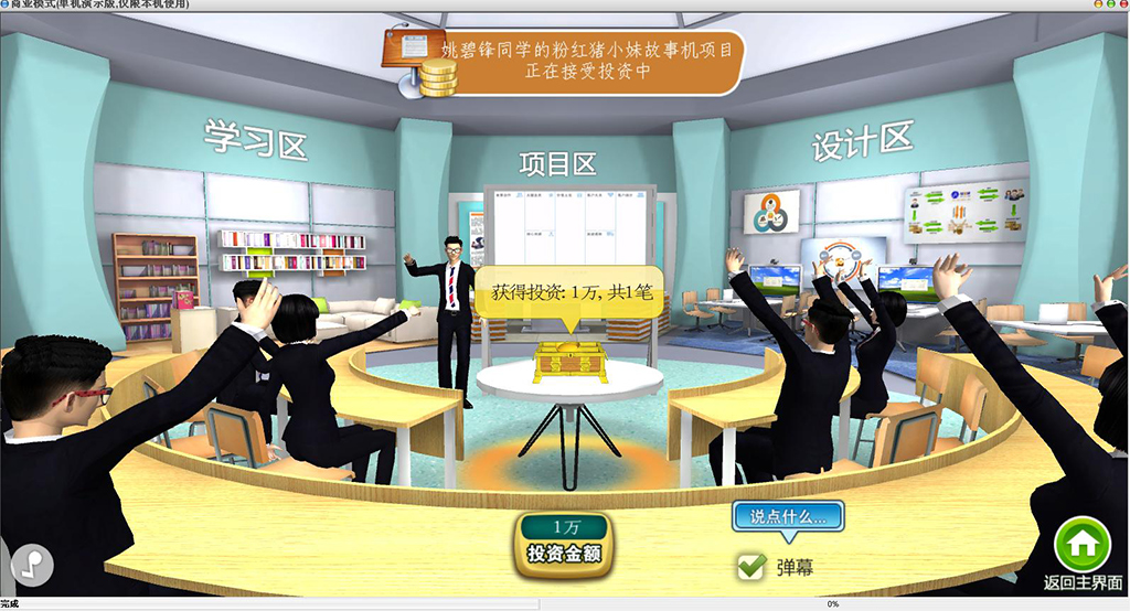 5、在项目路演环节,系统提供一套虚拟的路演系统,教师可以选择某位学员进行路演,其余学员屏幕则显示该同学的商业模式设计。软件同时提供一套虚拟的投融资系统,学员可以根据路演者商业模式设计及模拟路演情况,进行模拟投融资。通过这样的路演系统、投融资系统,实现学员商业模式的项目路演、投融资。同时教师、学员之间可以相互交流。