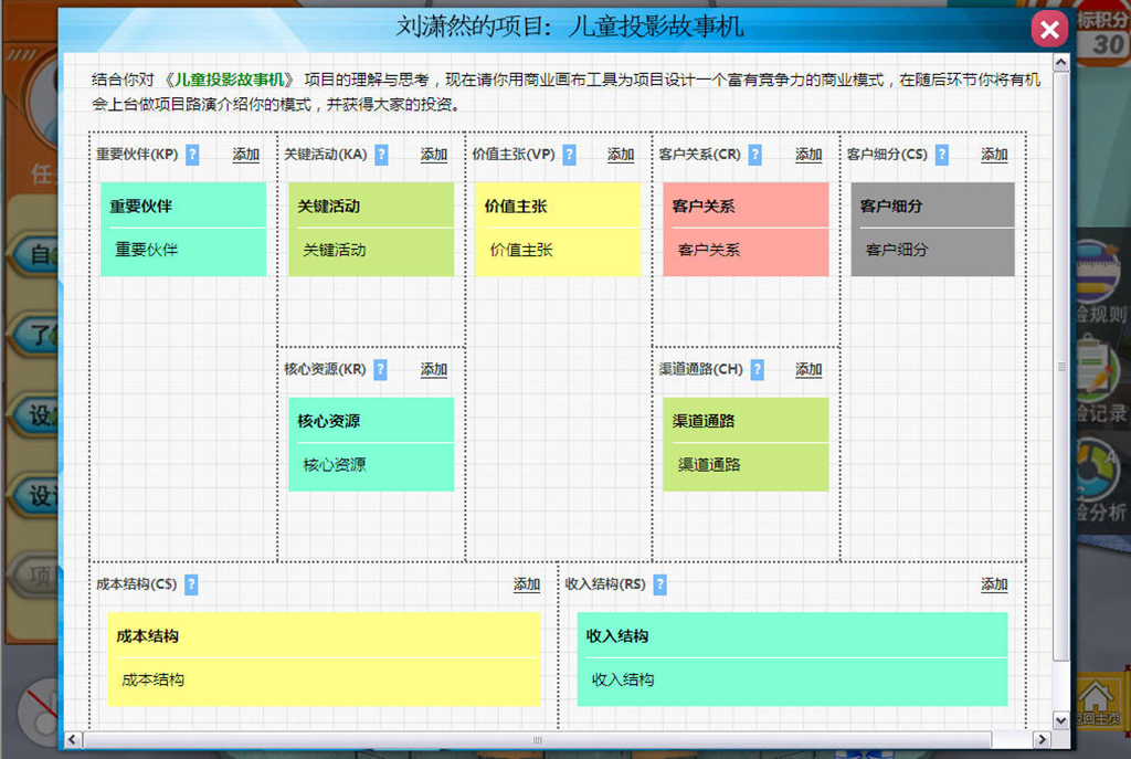 2、自主学习环节包含商业模式设计初识、商业模式设计进阶、商业模式项目路演。系统提供一套完整的商业画布分析设计工具,包含客户细分、价值主张、渠道通路、客户关系、收入来源、核心资源、关键业务、重要合作和成本结构9个要素。并提供不少于5个案例的商业模式供学员学习演练。学员可以通过此环节学习商业模式9大要素,并进行初步的模拟训练。