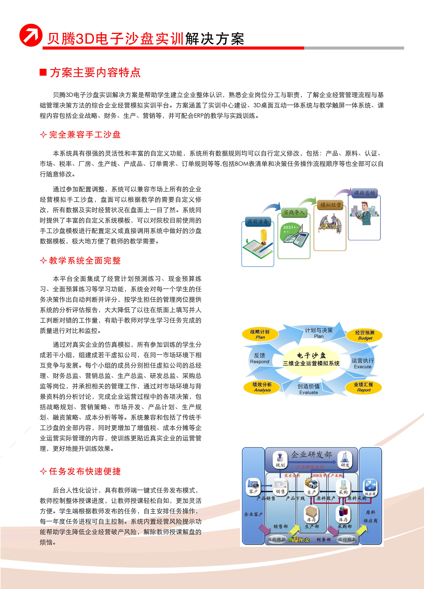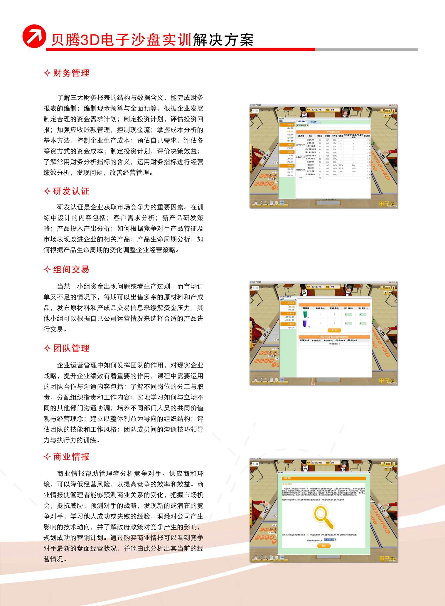 2、功能模块:包括企业战略、研发认证、市场开发、生产经营管理、市场营销、财务管理等功能模块,能够完整模拟企业经营中的各项决策任务;