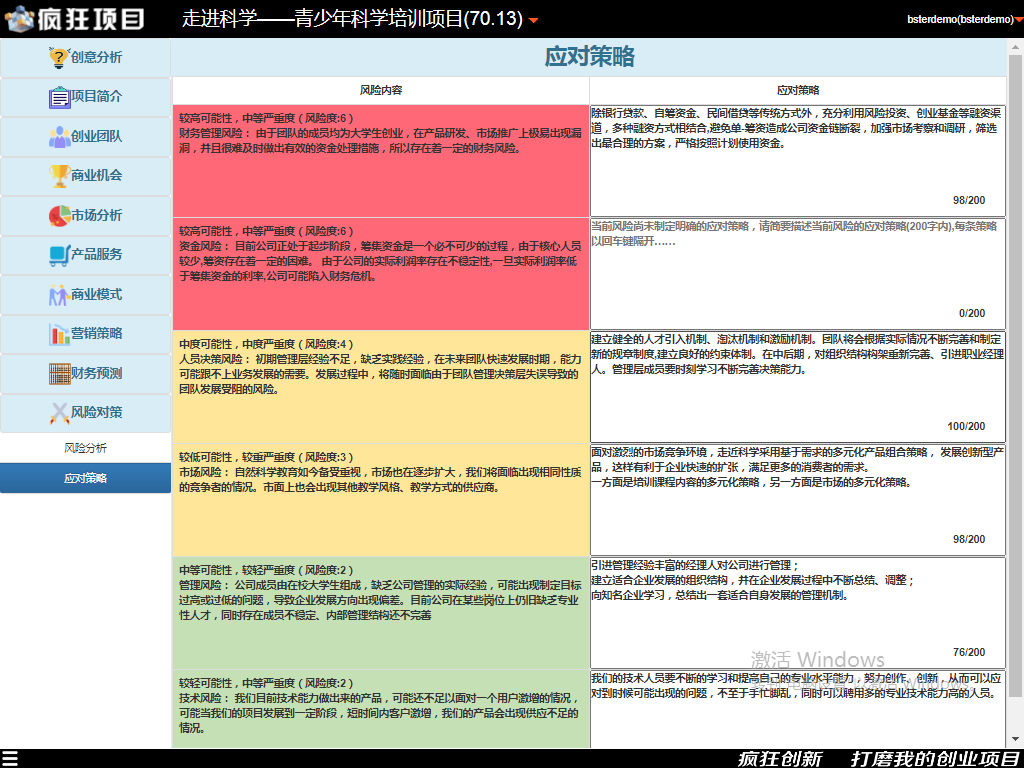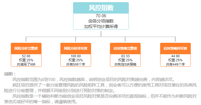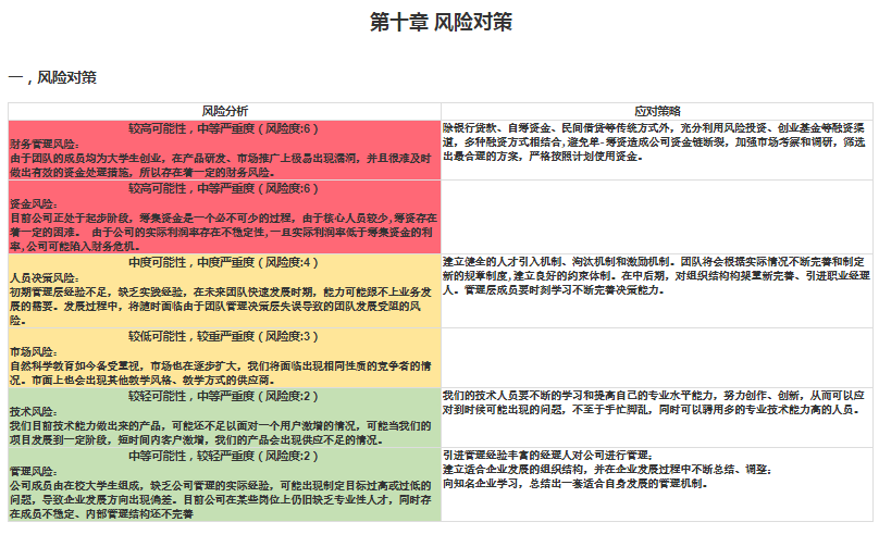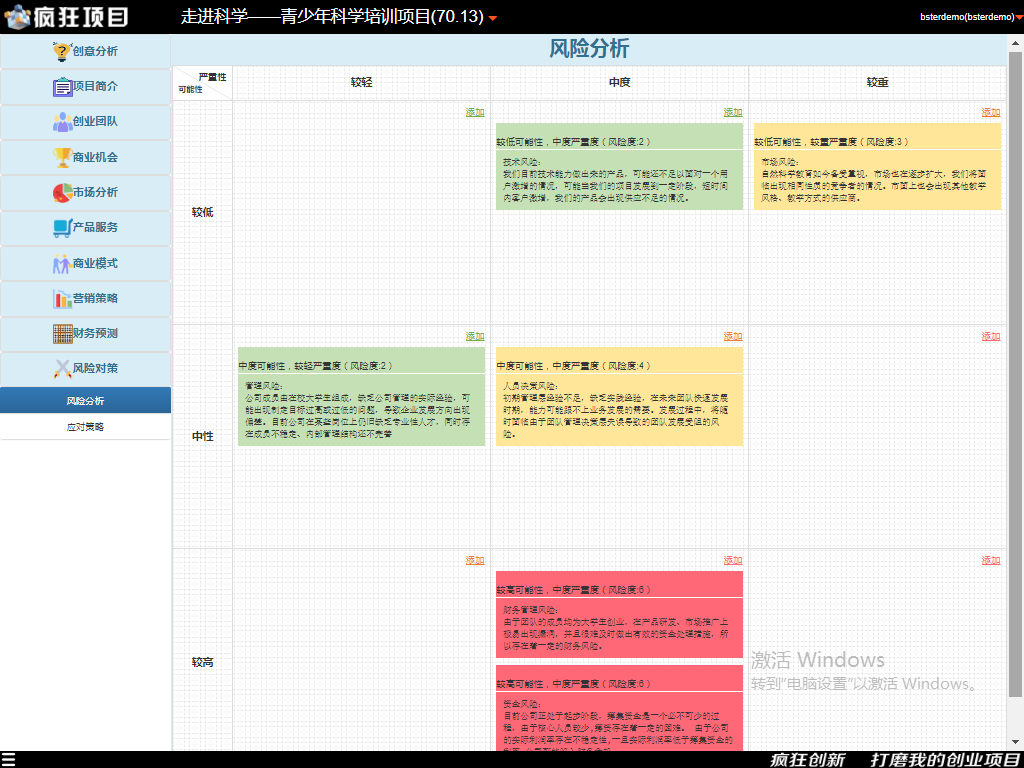 有了以上的基础,我们就可以借助《疯狂项目》平台的风险分析功能来具体展开创业项目的这部分内容了。平台内置了风险矩阵工具,创业者任意添加、删除、修改风险分析内容,系统自动根据风险等级显示不同的颜色。