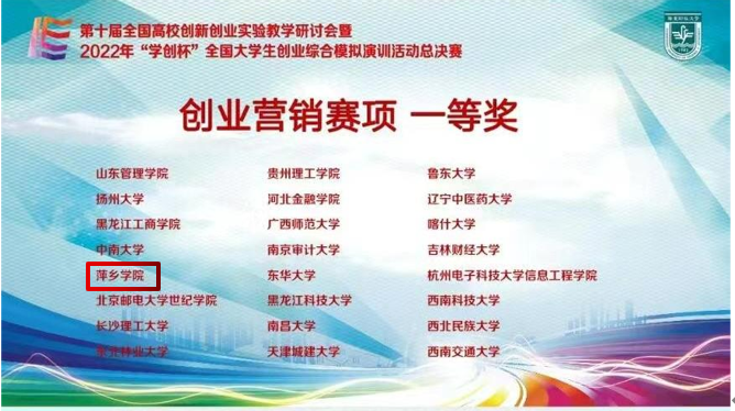 2022年“学创杯”全国大学生创业综合模拟大赛是我国为提升大学生创新创业能力举办的重要赛事。自确定参加国赛名单以来,学校领导高度重视,关注训练进度,给予莫大的支持和鼓励。参赛选手们在老师的带领下坚持不懈,永不言弃,不怕辛苦地备赛。最终也不负所望,在全国的赛场上赛出了本领,赛了出风貌,也为萍乡学院交上了一份令人满意的答卷。