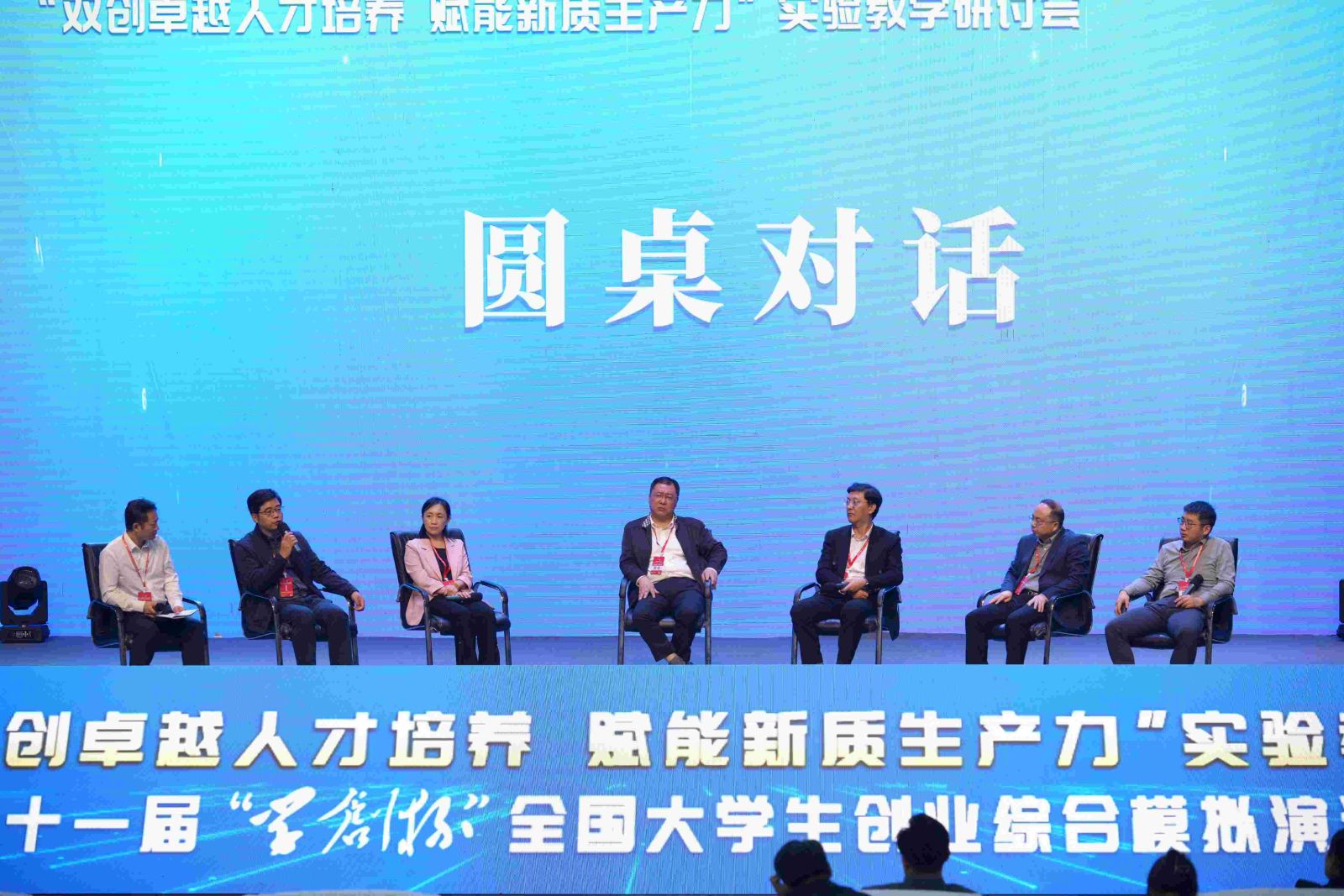 同期举行双创卓越人才培养,赋能新质生产力实验教学研讨会。主题演讲结束后,主办方邀请了多位嘉宾进行了圆桌会议,围绕“AI引入之后是否对教师行业进行冲击,如何应对?”等议题进行了深入探讨。