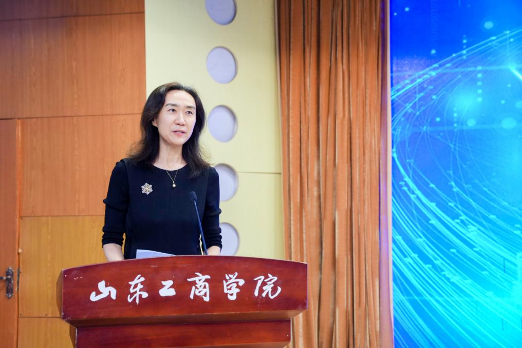 山东工商学院党委委员、副院长贾海宁对参加比赛的师生表示热烈欢迎。她强调学科竞赛对提升学生专业素养的重要性,将以赛事为载体,加强与高校协同联动,共同构建“校地协同、产教互通”育人生态,赋能数字经济与实体经济融合创新,注入青春动能。