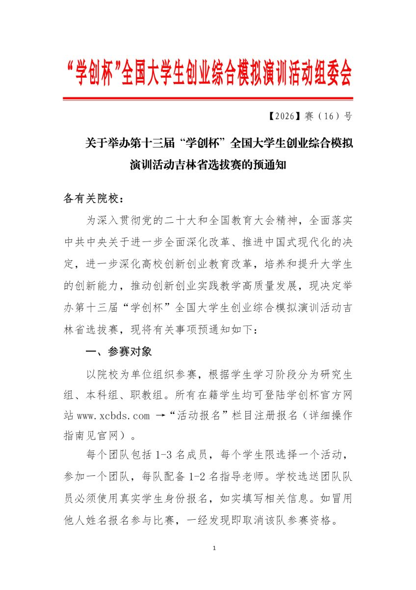 关于举办第十三届“学创杯”全国大学生创业综合模拟演训活动吉林省选拔赛的预通知