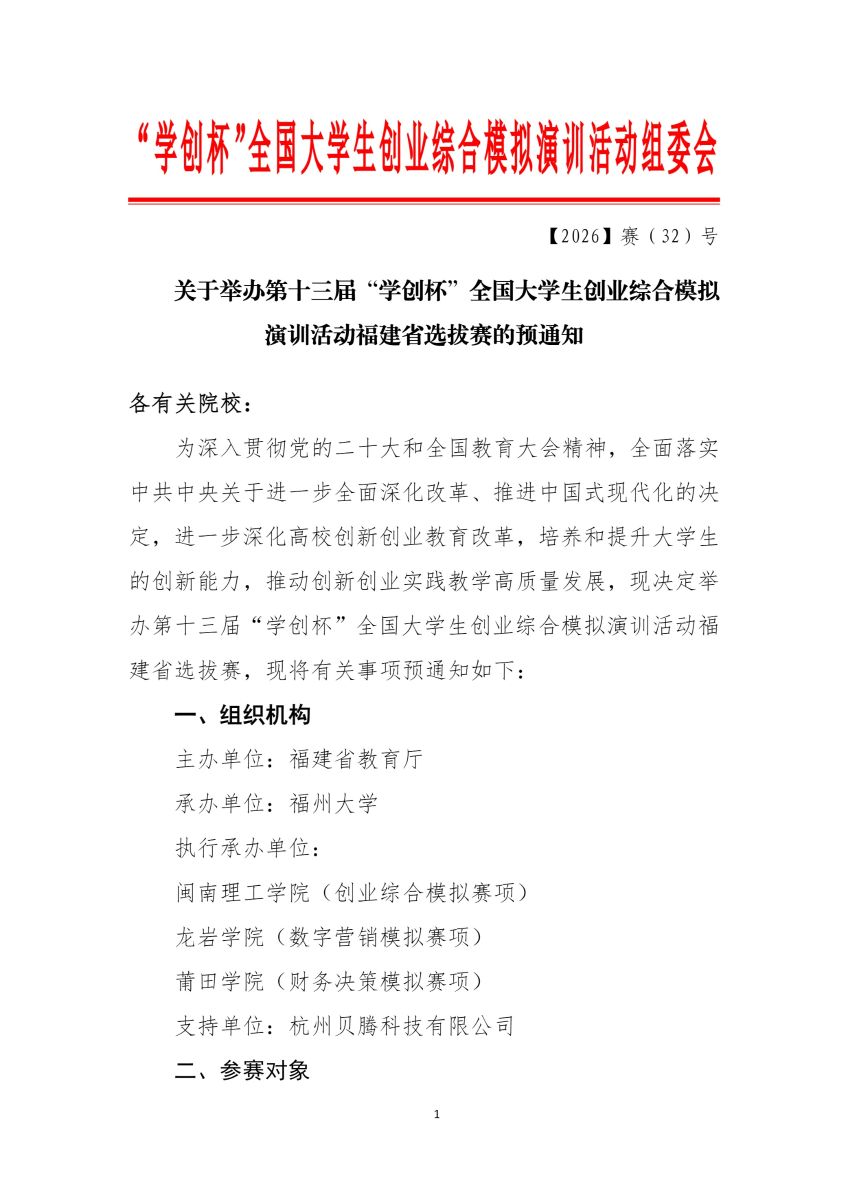 关于举办第十三届“学创杯”全国大学生创业综合模拟演训活动福建省选拔赛的预通知
