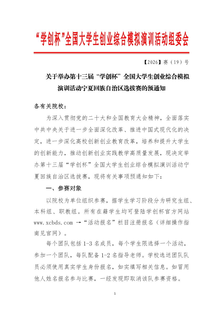 关于举办第十三届“学创杯”全国大学生创业综合模拟演训活动宁夏回族自治区选拔赛的预通知