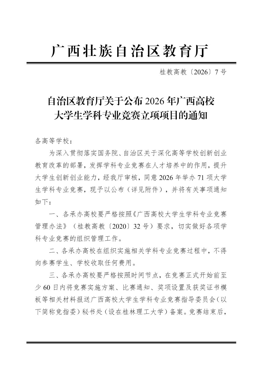 近日,广西壮族自治区教育厅发布《自治区教育厅关于公布 2026 年广西高校大学生学科专业竞赛立项项目的通知》,其中,2026 年“学创杯”全国大学生创业综合模拟大赛广西赛区选拔赛(本科组、职教组)列入竞赛项目!