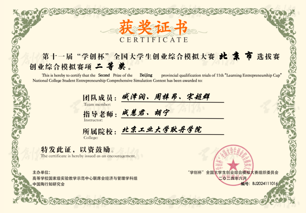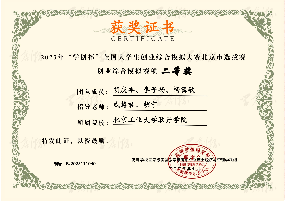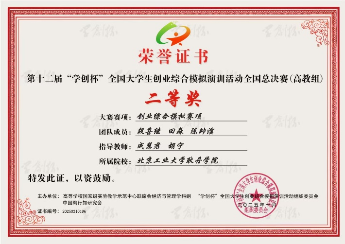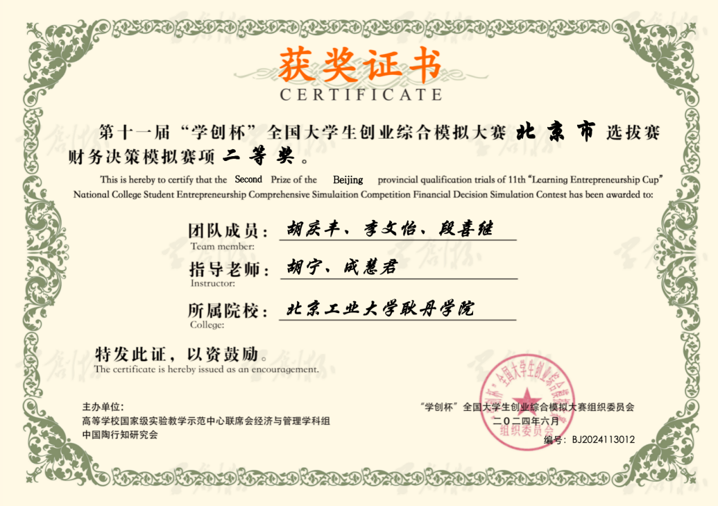秉承北京工业大学耿丹学院“应用型人才”培养理念,国际商学院财务管理专业坚持以赛促学、以赛促教、以赛促创,多年来积极组织学子参加“学创杯”全国大学生创业综合模拟大赛,在创业综合模拟与财务决策模拟两个赛道的省赛及国赛中屡获佳绩。参赛学子于高度仿真的虚拟商业场景中奋勇争先、锤炼技能,充分展现了耿丹学子的创新素养与实干精神,也集中体现了学院创新创业教育与专业人才培养深度融合的育人成效。