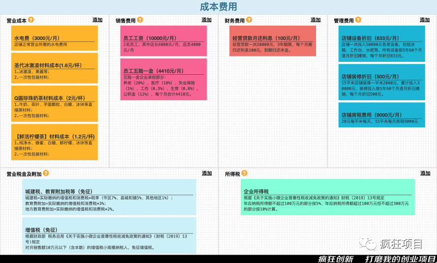 好了,到这里,我们使用《疯狂项目》内置的成本分析工具大致完成了疯狂饮品店的各项主要成本费用的梳理,工具以画布形式展现,创业者只需要结合自身创业项目,把相关的各项主要成本填入到相应区块即可,并可反复调整。