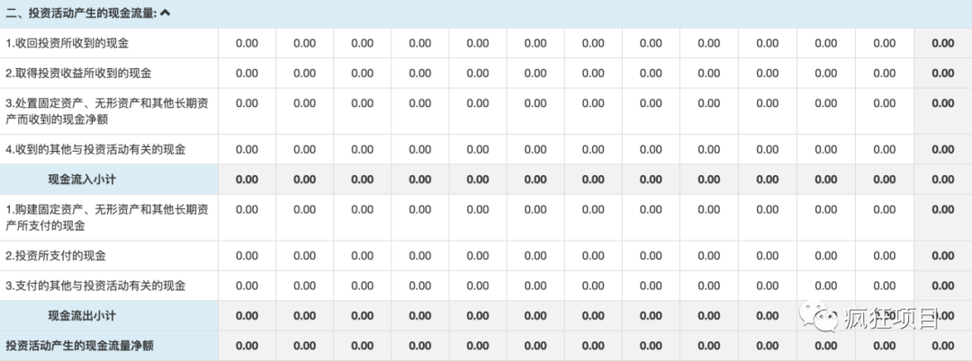 现金流量表是财务管理三大报表之一,主要用来持续跟踪企业每个阶段的现金流入与流出情况,下图是《疯狂项目》平台中内置的现金流量表工具,可以帮助我们高效率的完成项目的现金流量预测工作。