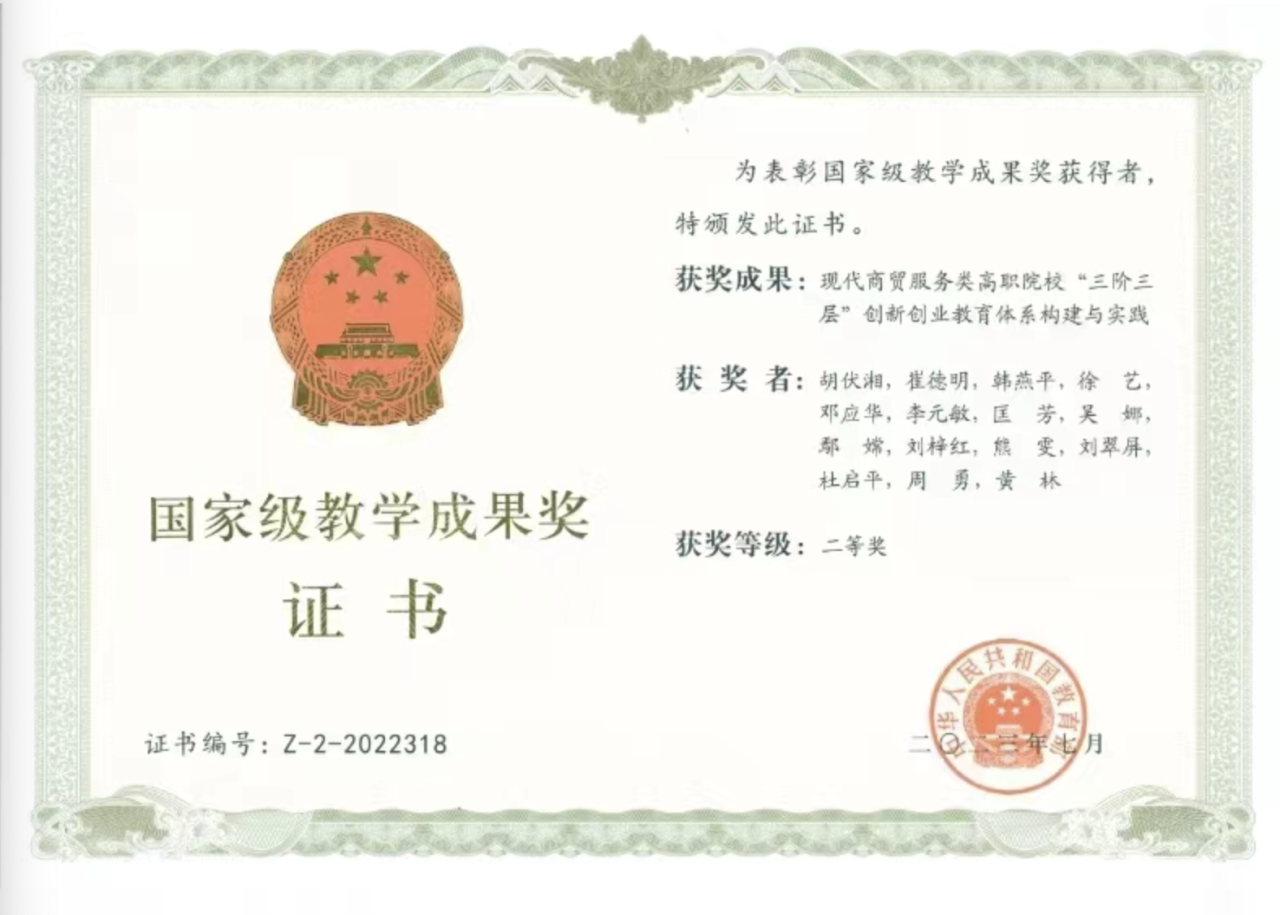2022年,在教育部组织的国家级教学成果奖评选中,由杭州贝腾科技有限公司牵头,携手长沙商贸旅游学院、湖南中华职业教育社联合申报的教改项目《现代商贸服务类高职院校“三阶三层”创新创业教育体系构建与实践》,凭借精准的问题导向、系统的体系设计和显著的实践成效,成功斩获高等教育国家级教学成果奖二等奖。此次获奖成果《现代商贸服务类高职院校“三阶三层”创新创业教育体系构建与实践》,聚焦现代商贸服务产业转型升级背景下,高职院校创新创业教育与专业教育脱节、人才培养与行业需求错位、实践平台支撑不足等核心痛点,依托三方资源优势协同攻关,构建了兼具系统性与针对性的创新创业教育解决方案。成果核心内涵可概括为“三阶递进、三层分类”的立体化培养体系:“三阶递进”即按照“认知启蒙—技能锤炼—实战孵化”三个阶段,“三层分类”则根据学生专业方向(如电子商务、旅游管理、会计金融等)、双创意愿和能力基础,分为“普及层、骨干层、精英层”实施差异化培养。