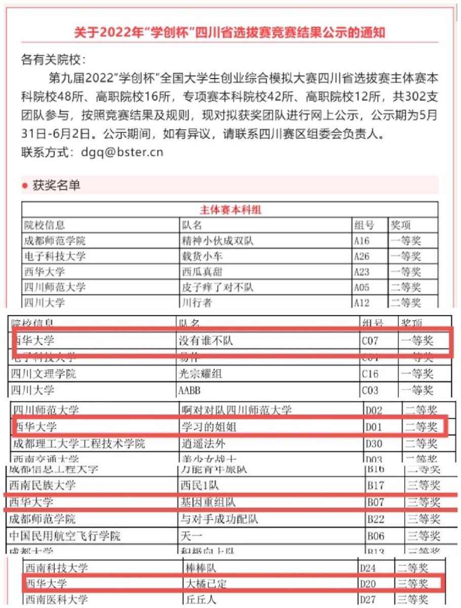 5月28至5月29日,2022年“学创杯”全国大学生创业综合模拟大赛四川省选拔赛于线上顺利开展。本届比赛的四川省省级选拔赛主体赛本科院校48所、高职院校16所,专项赛本科院校42所、高职院校12所,共302支团队参与。比赛结果于5月31日进行了公布,西华大学的6支参赛队伍稳定发挥,其中5支队伍脱颖而出,斩获一等奖两个,二等奖一个,三等奖两个。