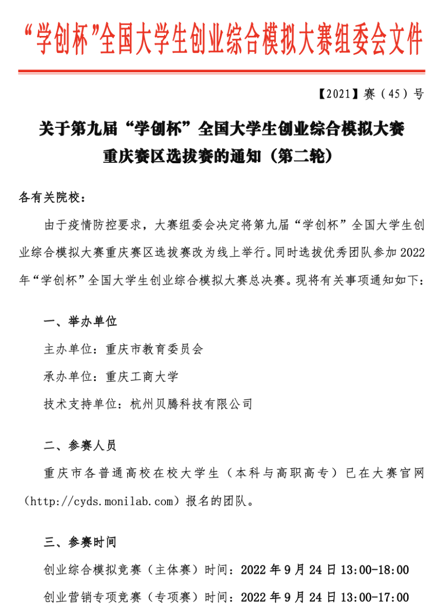 关于第九届“学创杯”全国大学生创业综合模拟大赛重庆赛区选拔赛的通知(第二轮)