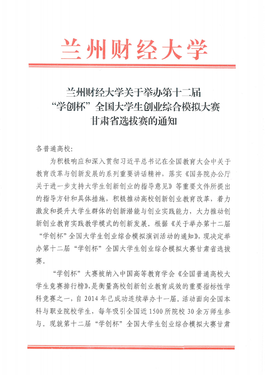 兰州财经大学关于举办第十二届“学创杯”全国大学生创业综合模拟大赛甘肃省选拔赛的通知(第二轮)
