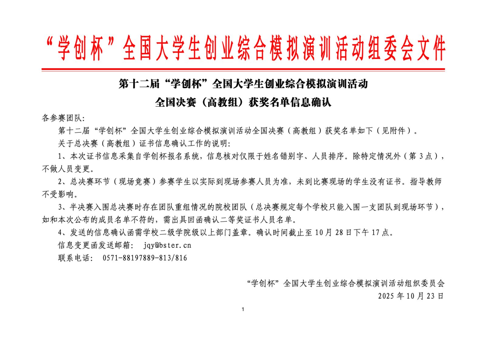 下载附件1:第十二届“学创杯”全国大学生创业综合模拟演训活动全国决赛(高教组)获奖名单信息确认