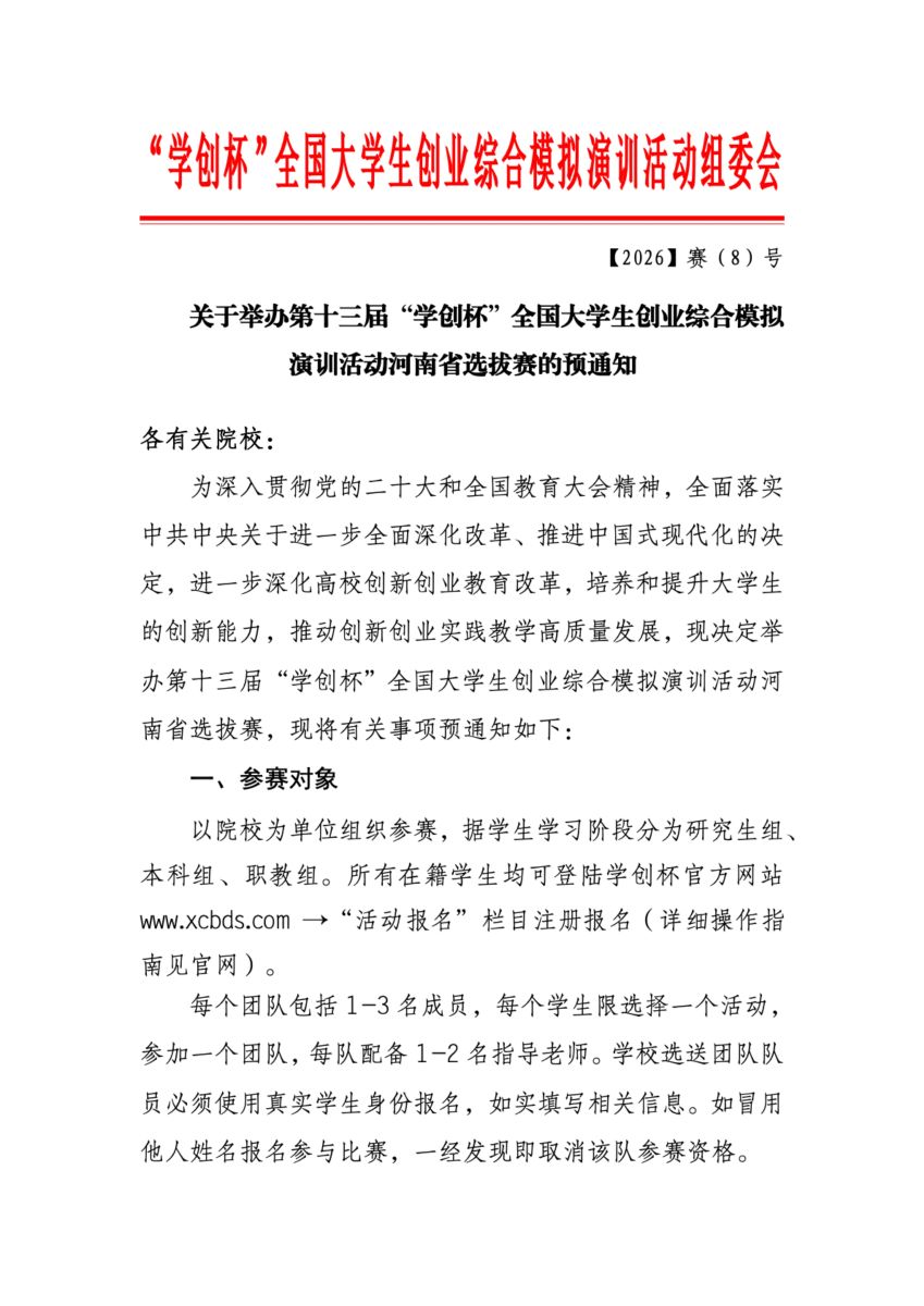 关于举办第十三届“学创杯”全国大学生创业综合模拟演训活动河南省选拔赛的预通知
