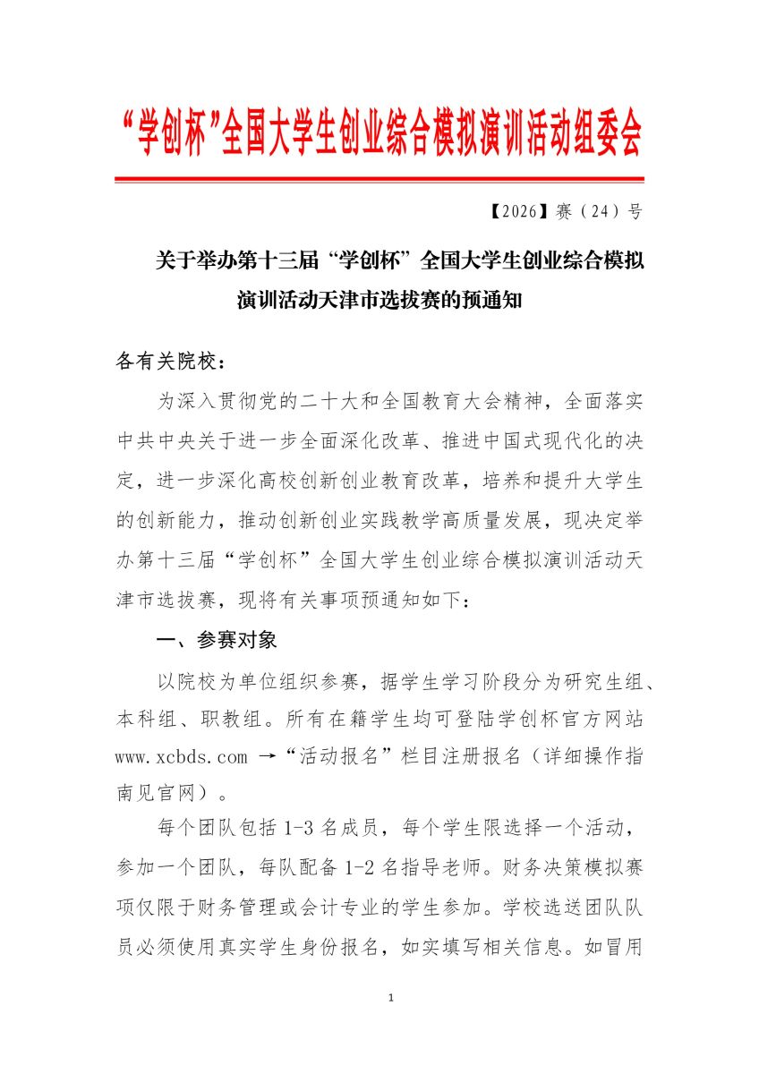 关于举办第十三届“学创杯”全国大学生创业综合模拟演训活动天津市选拔赛的预通知