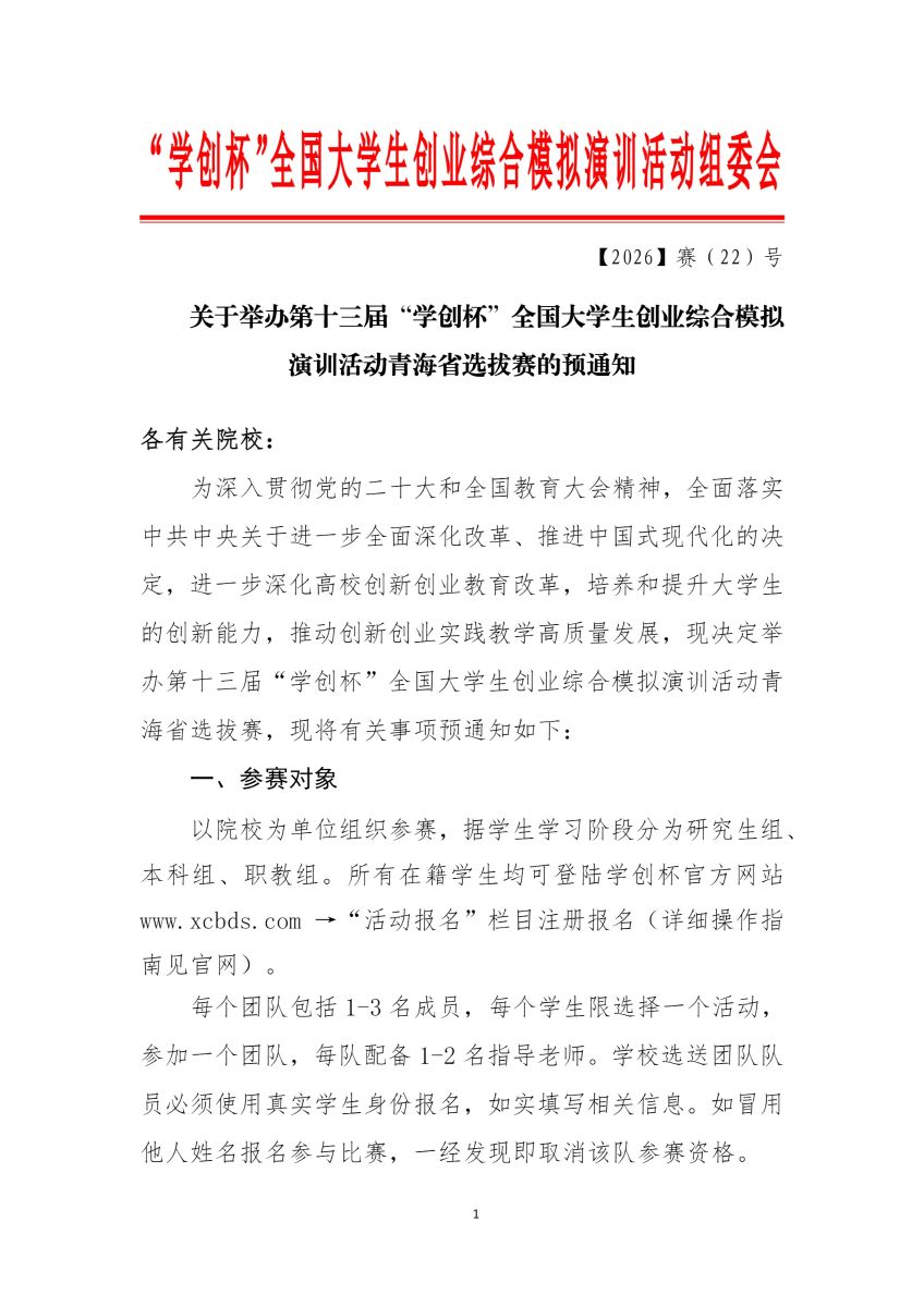 关于举办第十三届“学创杯”全国大学生创业综合模拟演训活动青海省选拔赛的预通知